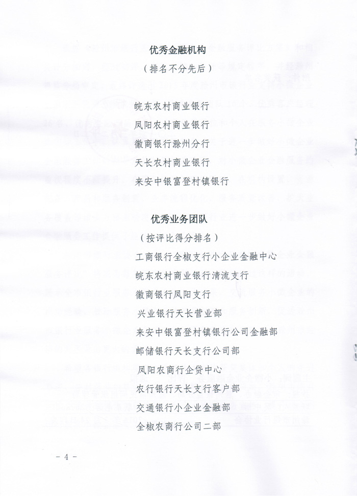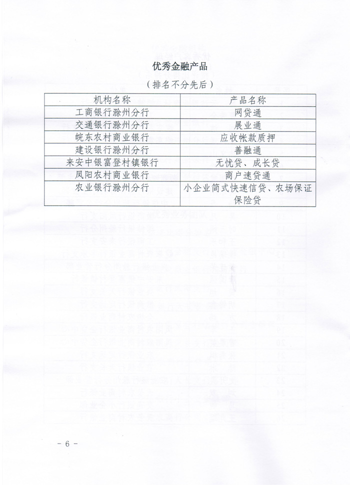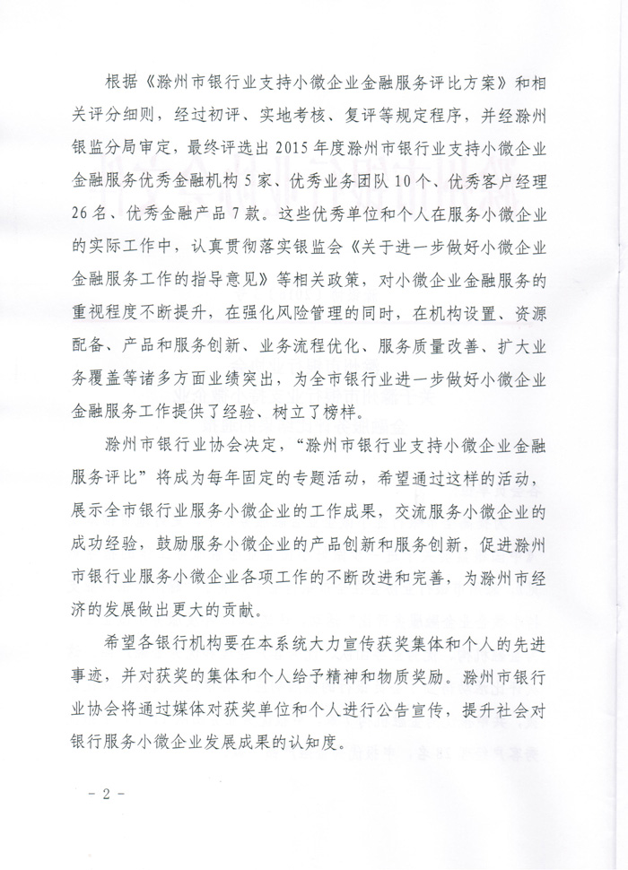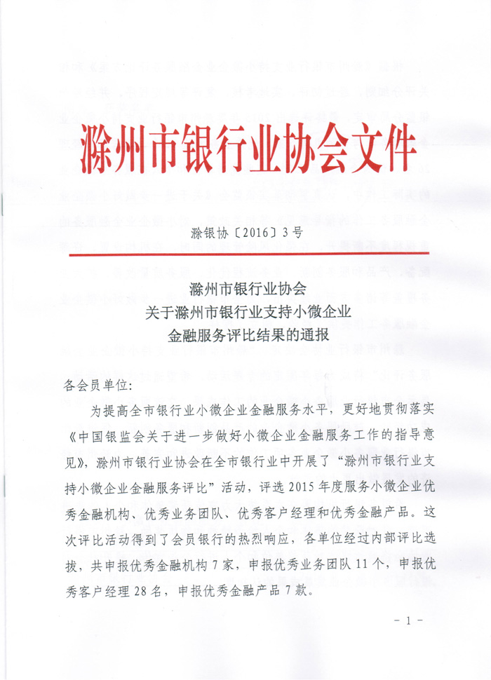 关于滁州市银行业支持小微企业金融服务评比结果的通报