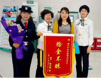 农行滁州分行员工“拾金不昧”获好评 发布日期: 2016-5-31 15:10:30 浏览人次: 1012 简介... 5月21日下午,农行滁州分行南谯南湖支行大堂经理和保安在进行ATM机设备巡检时,意外发现地上遗落一个钱包,拾起来一看,里面有现金近千元,银行卡多张,以及身份证等重要证件。大堂经理考虑到失主一定非常担心和着急,第一时间通过钱包内的身份证查询到该失主的联系电话联系到客户,客户随即冒着大雨赶来,看到失而复得的钱包,感动不已,连声道谢!随后还送来锦旗表示感谢。(农行办公室)