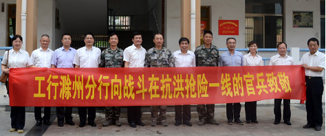 工行滁州分行赴巢湖慰问驻滁部队抗洪抢险官兵 发布日期: 2016-7-20 17:43:00 浏览人次: 864 简介... 7月14日,工行滁州分行党委书记、行长周晨光、副行长黄学东率机构部、琅琊支行负责人等一行赶赴巢湖,来到正在巢湖、无为方向执行抢险救灾任务的驻滁州73091部队临时驻地,向抗洪官兵送去亲切的节日慰问。7月份以来的持续强降雨,导致长江中下游水位猛涨,加大了合肥巢湖境内的数十个重要堤圩的承载压力。险情就是命令。驻滁73091部队根据上级命令,于7月3日凌晨起先后派出2000余名官兵分赴无为县、巢湖、枞阳等地执行抗洪抢险任务。在巢湖、无为部队临时驻地,党委书记、周晨光行长代表市分行党委和全体员工向抗洪官兵致以节日的问候,期盼抗洪官兵早日凯旋。周行长还就部队提出的金融需求当场表态,一定一如既往地为部队官兵提供优质的金融服务。(工行办公室)