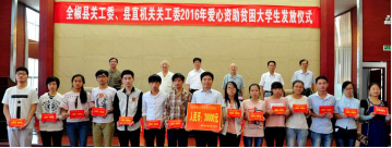 8月28日,由县关工委牵头发起,县农商行、建设局、交通局、财政局和人社局五家单位献爱心,共同资助2016年贫困大学生发放仪式在全椒农商行举行。县委副书记孔祥宁、县关工委主任马友华等领导出席并讲话。自2013年以来,全椒农商行连续4年通过县关工委牵头,向当年新入学贫困大学生每年捐款3万元,共资助了60名贫困大学新生。金额达12万元。(杨勇)