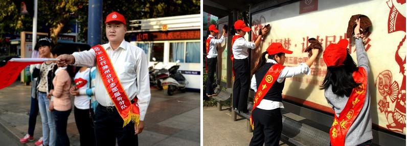 为贯彻落实滁州市委市政府“当好东道主,喜迎农歌会”的号召,10月10日至13日,工行滁州分行组织志愿者沿着南谯路与琅琊大道路口至天长路路段两侧捡拾垃圾,擦洗公交站台广告牌等公共设施;参加“平安出行,文明礼让”志愿服务活动。中行滁州分行组织志愿者服务队走上街头,义务清扫马路,打扫卫生死角;在交通要道疏导交通,搀扶老人安全通过路口。交行滁州分行组织志愿者,对丰乐路与天长路琅琊路交叉口主干道两侧、公交站台及部分公园广场等公共服务场所进行清洁打扫,干干净净迎歌会。(协会秘书处综合) |