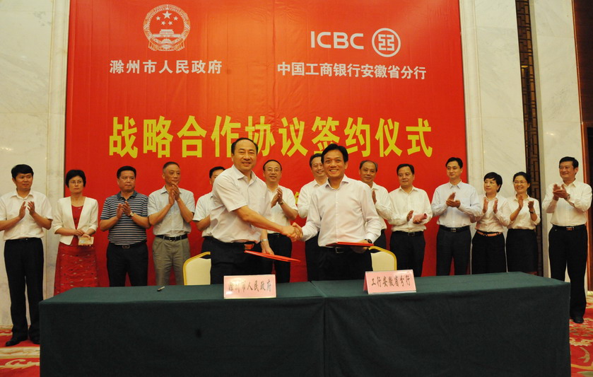 7月10日下午,工行安徽省分行与滁州市人民政府在滁州签署《金融服务战略合作协议》,胡伟谊行长,赵洪亚副行长,滁州市委副书记(主持市委工作)、市长张祥安,朱诚常务副市长等出席签约仪式。